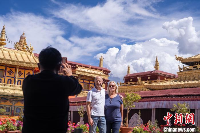 9月17日,外國游客在西藏拉薩大昭寺合影留念。中秋佳節(jié),距今已有1300多年歷史、2000年作為布達(dá)拉宮擴(kuò)展項目列入《世界遺產(chǎn)名錄》的拉薩大昭寺迎來眾多游客。中新社記者 貢嘎來松 攝