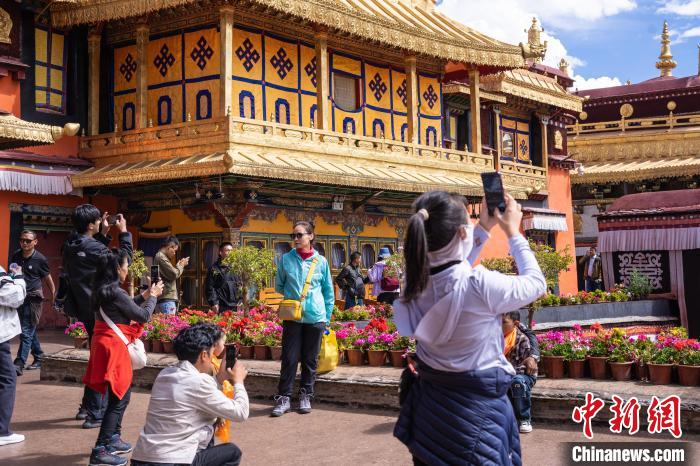 9月17日,游客在西藏拉薩大昭寺拍攝藏服寫真。中秋佳節(jié),距今已有1300多年歷史、2000年作為布達(dá)拉宮擴(kuò)展項目列入《世界遺產(chǎn)名錄》的拉薩大昭寺迎來眾多游客。中新社記者 貢嘎來松 攝