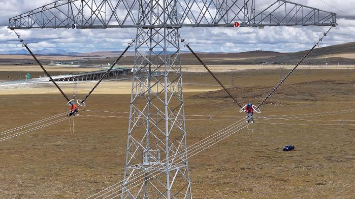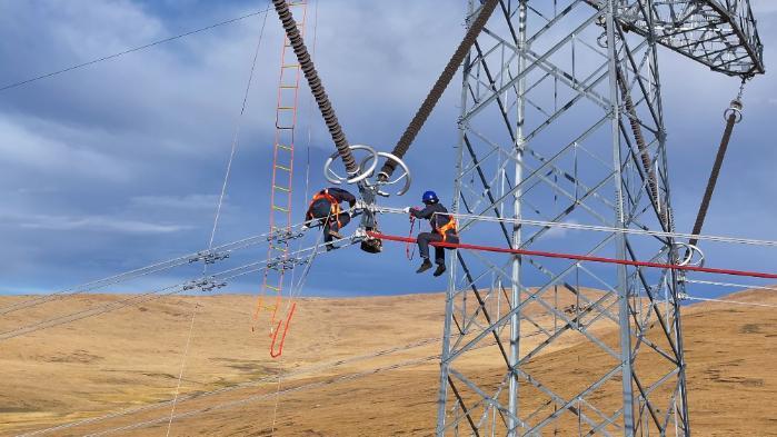 于是在接下來(lái)的幾天,記者跟隨著青藏聯(lián)網(wǎng)工程線路年檢工作人員沿著檢修輸電線路從拉薩市林周縣出發(fā)到那曲市安多縣境內(nèi),在此期間,記者經(jīng)歷了一年四季的天氣變化。9月20日,在青藏聯(lián)網(wǎng)工程西藏側(cè)林周段年檢現(xiàn)場(chǎng)2329號(hào)塔位,2名檢修人員正在40多米的高空檢查絕緣子、金具、導(dǎo)地線、引流板和間隔棒。與此同時(shí),“電力天路”上還有15名國(guó)網(wǎng)西藏電力輸電線路檢修人員同步穿梭在鐵塔與銀線之間,開展年度檢修作業(yè)。