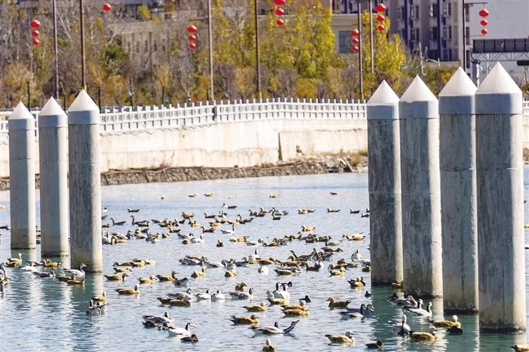 開闊的河面上,斑頭雁、黃鴨、赤麻鴨等鳥類往來于此,此起彼伏的叫聲不絕于耳。在陽光的照射下水面波光粼粼,候鳥或嬉游、或覓食、或追逐,這一和諧優(yōu)美的景象,引得不少觀賞的市民和游客舉起手機(jī)或相機(jī)記錄。