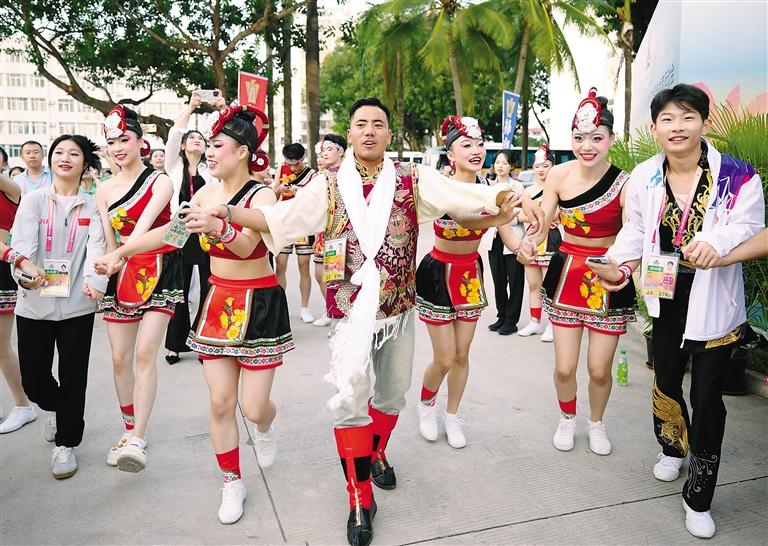 11月26日,運(yùn)動(dòng)會(huì)特別安排了“民族大聯(lián)歡”活動(dòng)。獨(dú)具海南特色的牛角號(hào)與蛙鑼齊齊奏響,喜迎八方賓客,表演者、運(yùn)動(dòng)員、教練員一起手拉手載歌載舞。西藏運(yùn)動(dòng)員身著盛裝,和來自北京西藏中學(xué)的運(yùn)動(dòng)員一起唱藏歌、跳鍋莊、送禮物,和香港特別行政區(qū)運(yùn)動(dòng)員互送吉祥物、紀(jì)念品,相互交流、拍照留念。