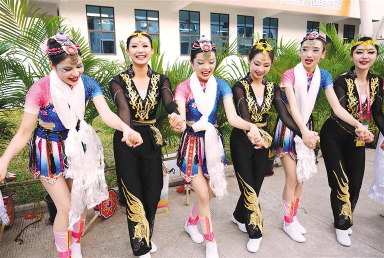 第十二屆全國(guó)少數(shù)民族傳統(tǒng)體育運(yùn)動(dòng)會(huì)西藏代表團(tuán)民族健身操運(yùn)動(dòng)員賽后與福建代表團(tuán)運(yùn)動(dòng)員一起跳鍋莊。