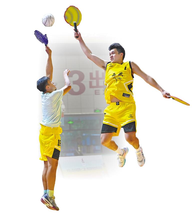 第十二屆全國(guó)少數(shù)民族傳統(tǒng)體育運(yùn)動(dòng)會(huì)西藏代表團(tuán)運(yùn)動(dòng)員在進(jìn)行珍珠球比賽賽前熱身。