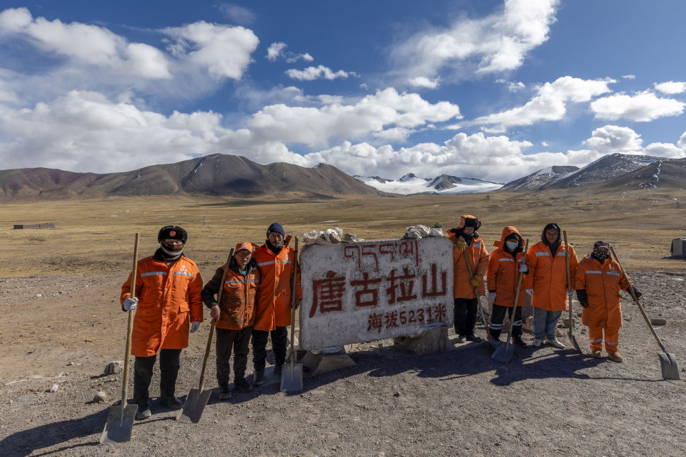記者一行到達(dá)唐古拉山口時(shí),7名身穿橙色制服的養(yǎng)路工人,正在用鐵鍬修補(bǔ)路肩。盡管太陽高懸,風(fēng)速卻不小,用來警示隔離的錐形交通路標(biāo)不斷被大風(fēng)吹倒,工人們不時(shí)要把它們扶正。