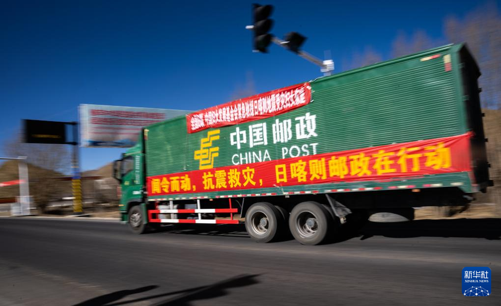 1月8日,在日喀則市境內(nèi)的318國道旁,中國郵政的抗震救災物資運輸車輛向震中方向駛?cè)?。新華社記者 丁增尼達 攝