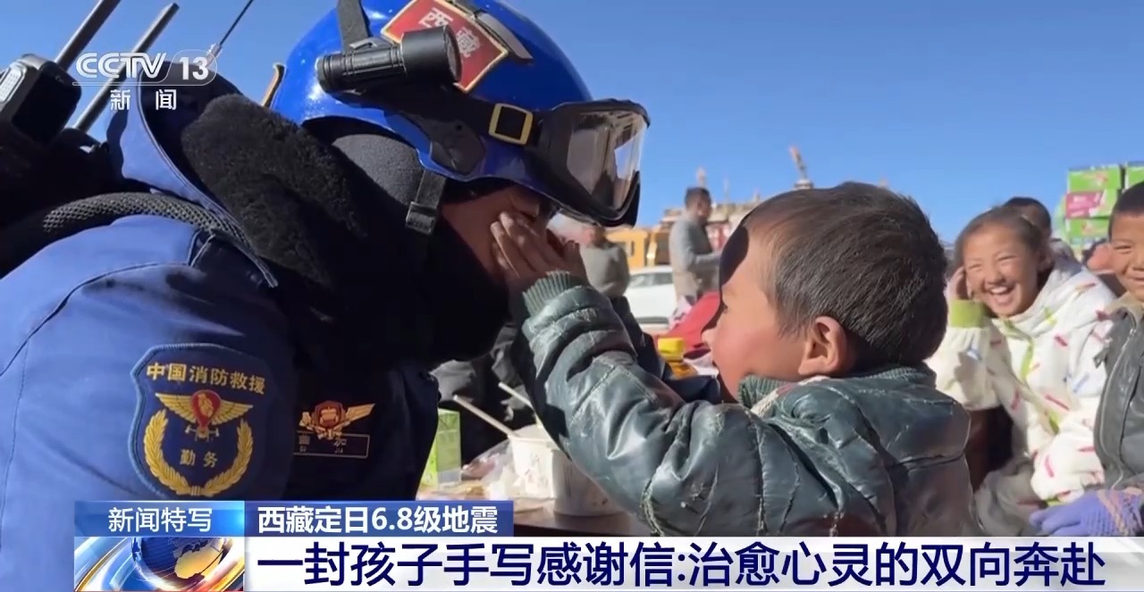西藏森林消防總隊(duì)教育宣傳處助理員 鄭龍:能感覺到孩子在地震里受到的驚嚇正在慢慢減少,還會主動過去找消防員玩,主動“受領(lǐng)任務(wù)”,幫忙搬運(yùn)物資。