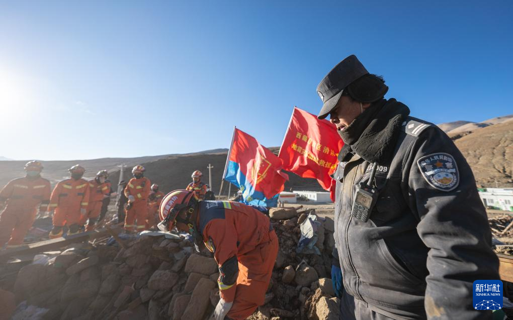 1月13日,在定日縣長所鄉(xiāng)古榮村,消防員在搜尋次仁扎西老人家里的青稞。新華社記者 丁增尼達 攝