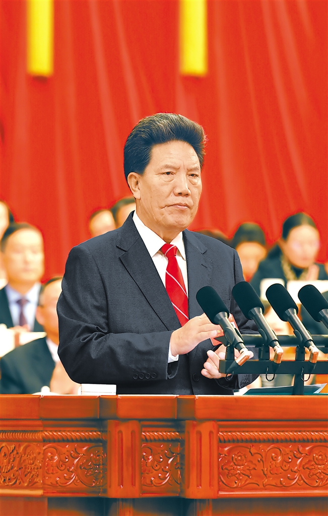 全國人大常委會副委員長、自治區(qū)人大常委會主任洛桑江村向大會作自治區(qū)人大常委會工作報告。記者 次仁平措 攝