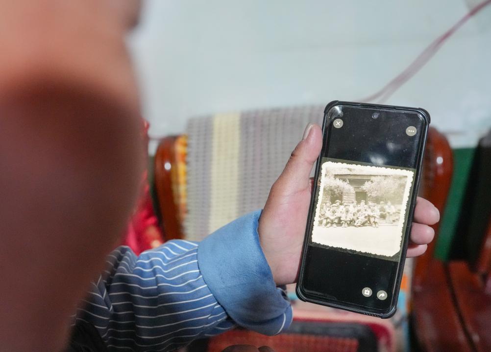 1月29日,孫建學翻看手機上留存的年輕時修路的照片。新華社記者 晉美多吉 攝