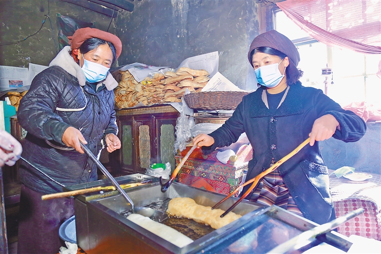 旦索朗一家,在每年藏歷新年前夕,都會(huì)開(kāi)啟一年中最為繁忙的時(shí)光——經(jīng)營(yíng)“卡賽”生意。旦索朗回憶往昔,感慨萬(wàn)千:“小時(shí)候過(guò)年,炸‘卡賽’是家家戶戶的頭等大事,整個(gè)村子都彌漫著誘人的香氣,那是新年專(zhuān)屬的味道。如今,時(shí)代在變遷,人們的生活方式也發(fā)生了改變,越來(lái)越多的人選擇購(gòu)買(mǎi)成品‘卡賽’,這既契合了快節(jié)奏的現(xiàn)代生活,也為我們提供了發(fā)展的機(jī)遇。我們經(jīng)營(yíng)‘卡賽’生意已有6年,這期間,靠著誠(chéng)信經(jīng)營(yíng)和對(duì)高品質(zhì)的堅(jiān)守,生意蒸蒸日上,還帶動(dòng)了6名村民共同增收,大家一起用雙手創(chuàng)造美好生活?!?/p>