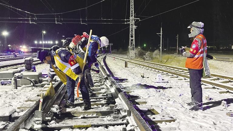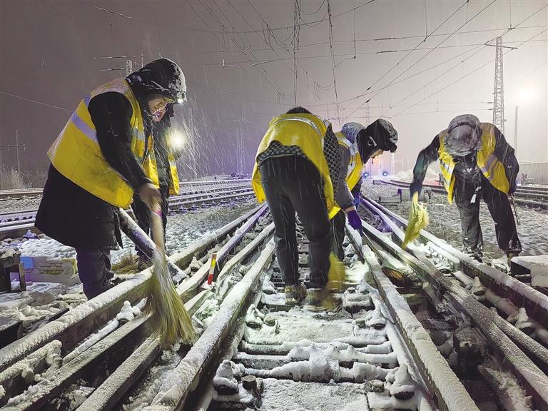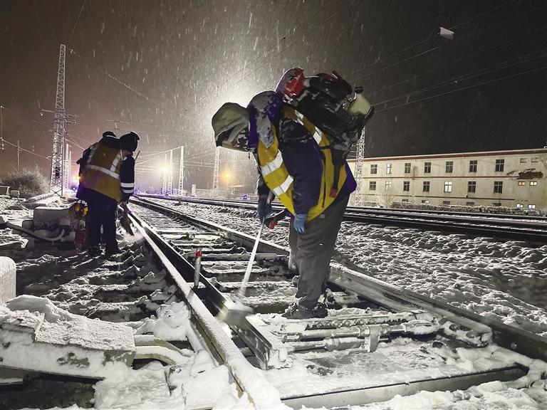 “掃雪時要注意腳下,防止滑倒……”到達拉薩西貨場1號道岔后,工長白登渠影帶領職工們按照分工,有序地使用掃把、除雪鏟、除雪鉤、吹雪機等工具,對道岔尖軌、滑床板、轉(zhuǎn)轍部位等關鍵位置的積雪進行清理。在紛紛揚揚的大雪中,大家踩雪發(fā)出的“嘎吱”聲、雪鏟除冰的敲擊聲交織在一起。